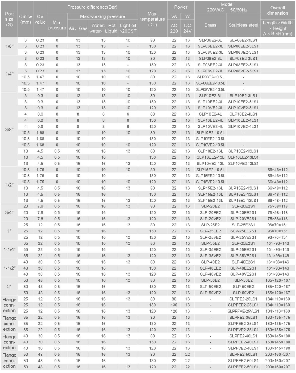 | Port Size (G) | Orifice (mm) | CV Value | Pressure difference(Bar) | Max. temperature (℃) | Power | Model 220VAC 5C/60Hz | |||||