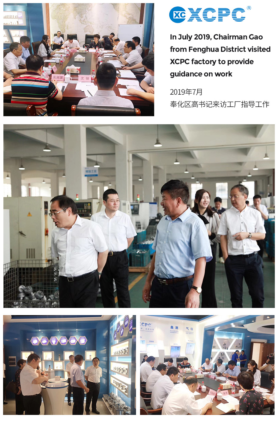 In July 2019, Mr. Gao, the Party Secretary of Fenghua District, and his accompanying staff visited the XCPC factory for inspection and guidance. The leaders successively toured and inspected the precision workshop and the automated production workshop, listened carefully to the report on the enterprise's production and operation situation, and put forward guiding suggestions on on-site production management.